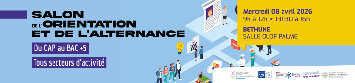 La Communauté d’Agglomération de Béthune-Bruay, en partenariat avec France Travail, la Mission Locale de l’Artois et la Plateforme Proch’Emploi de Béthune-Bruay, te donne rendez-vous pour « Le salon de l'orientation et de l'alternance ».