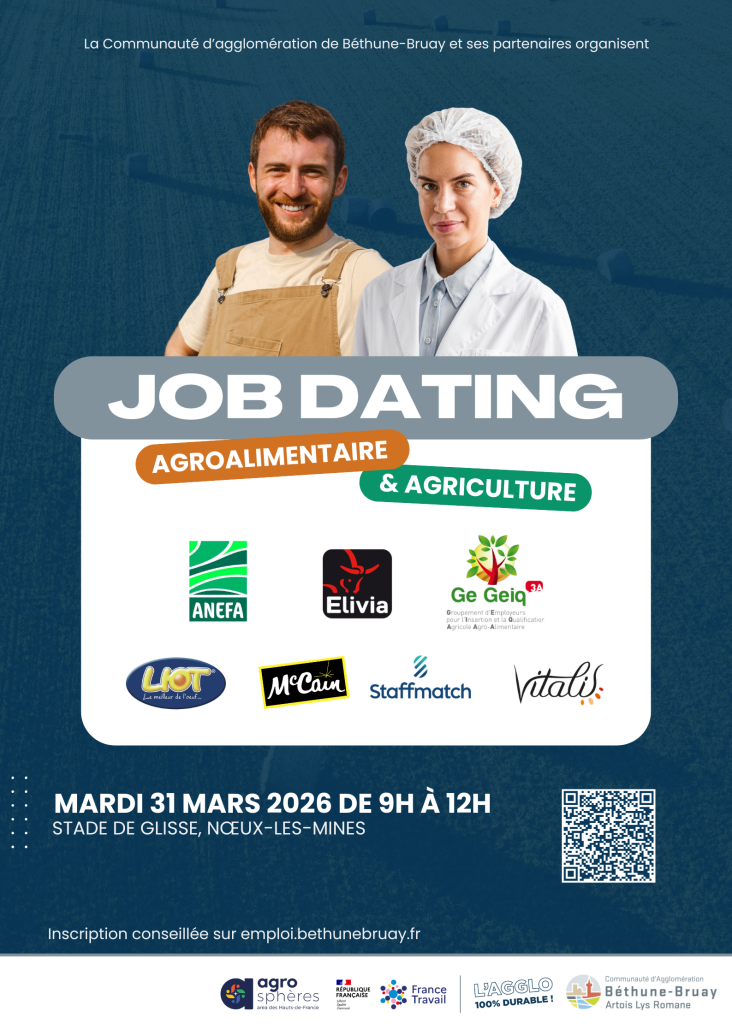 Ne manquez pas le Job Dating Agroalimentaire-Agriculture qui se tiendra le mardi 31 mars de 9h à 12h. Une opportunité unique pour rencontrer les entreprises qui recrutent sur le territoire !